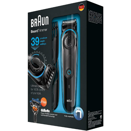2 trimming combs and precision dial offer 39 length settings from 0.5 – 20mm for any beard or hair style. Combined with lifetime sharp blades, the Braun BeardTrimmer guarantees ultimate precision for an even cut and accurate lines and edges. Plus free Gillette Fusion5 ProGlide razor for a clean shave.